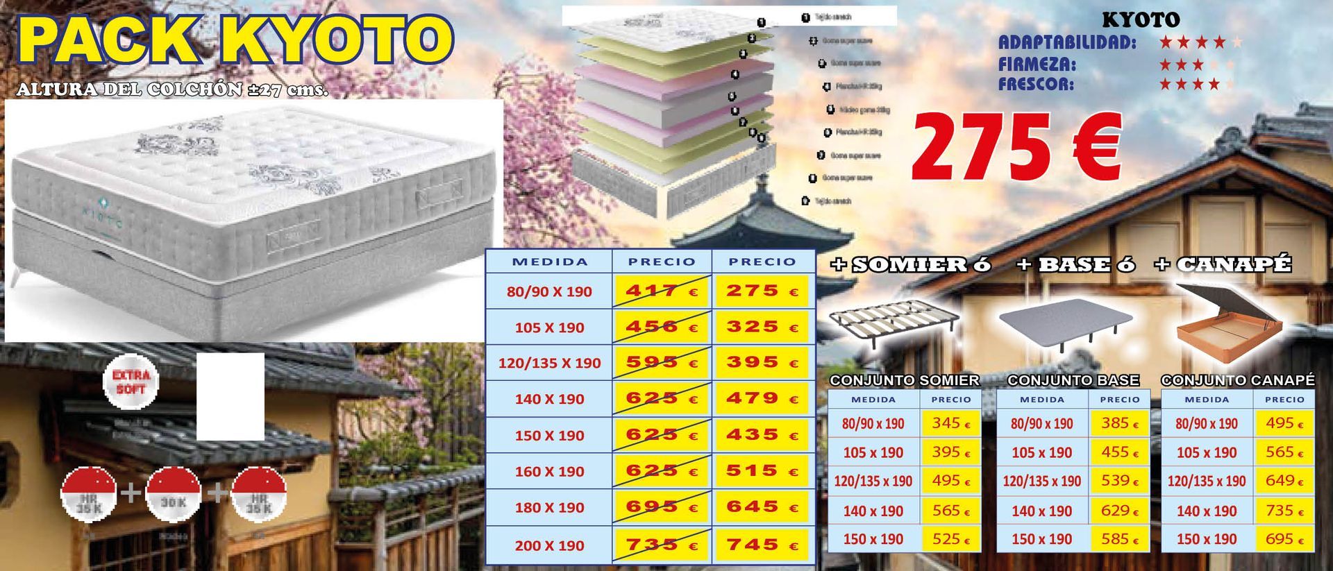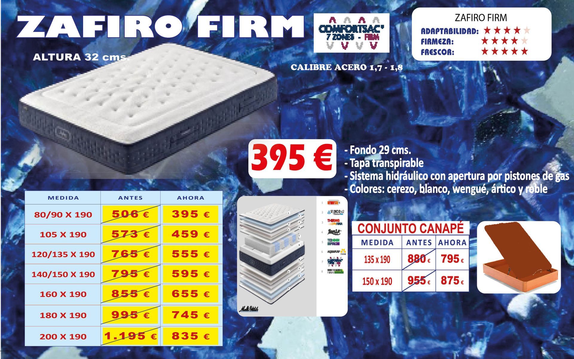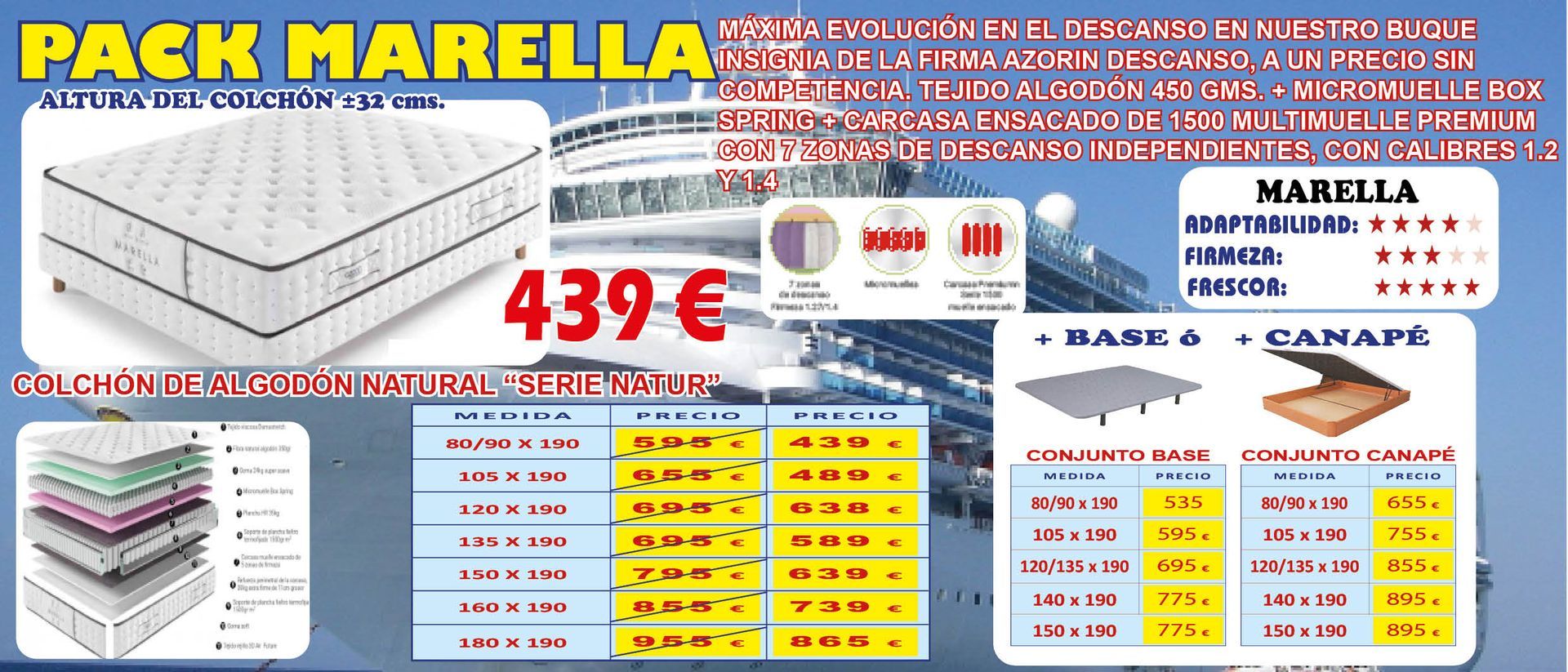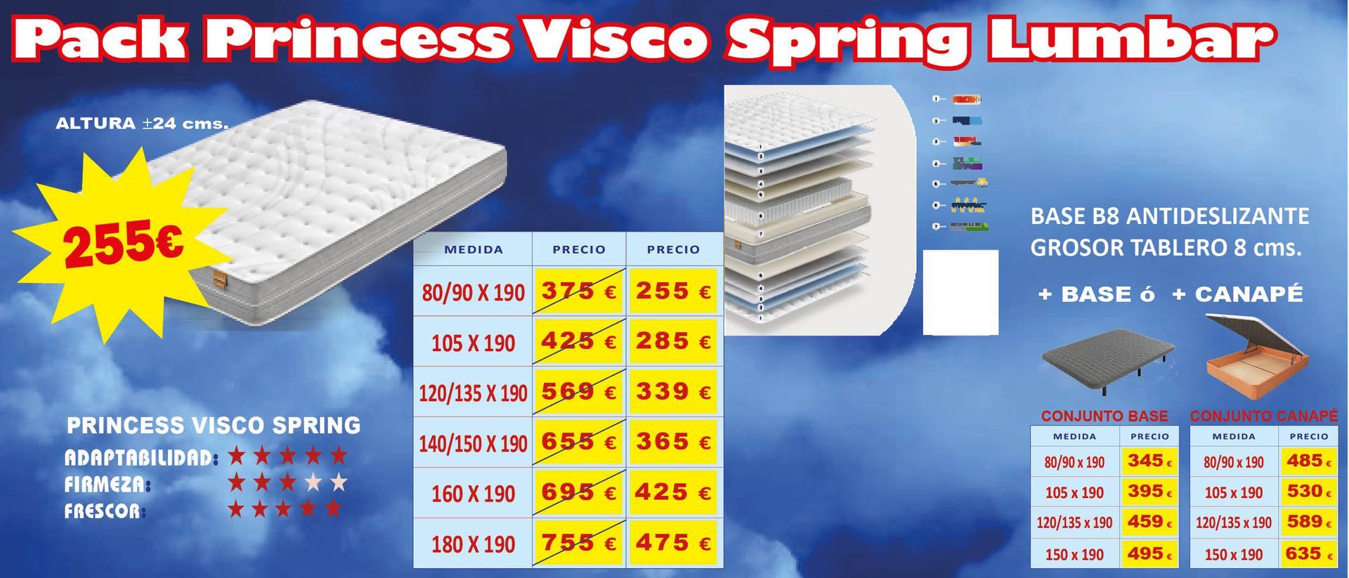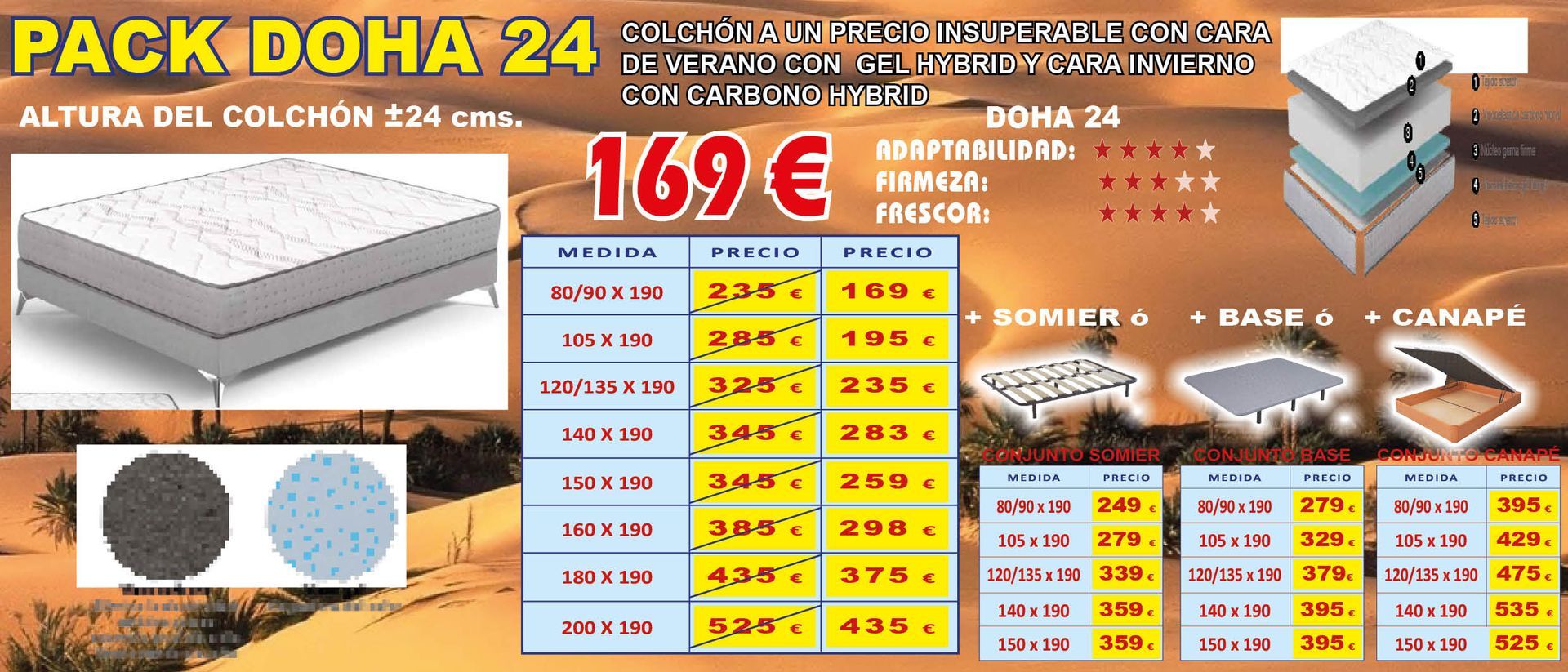 Tampoco vamos a decir que somos pioneros en el Sector Descanso. Lo que sí podemos decir, ALTO Y CLARO, es que tenemos los PRECIOS MÁS ATRACTIVOS y COMPETITIVOS del mercado, tanto en gama alta, como en gama standar de colchones, adaptándonos a todos los bolsillos y, en muchas ocasiones, negociando el precio de venta final, con grandes descuentos u obsequiando almohadas viscoelásticas o fundas de colchón para su nuevo equipo de descanso... Compruebelo.
